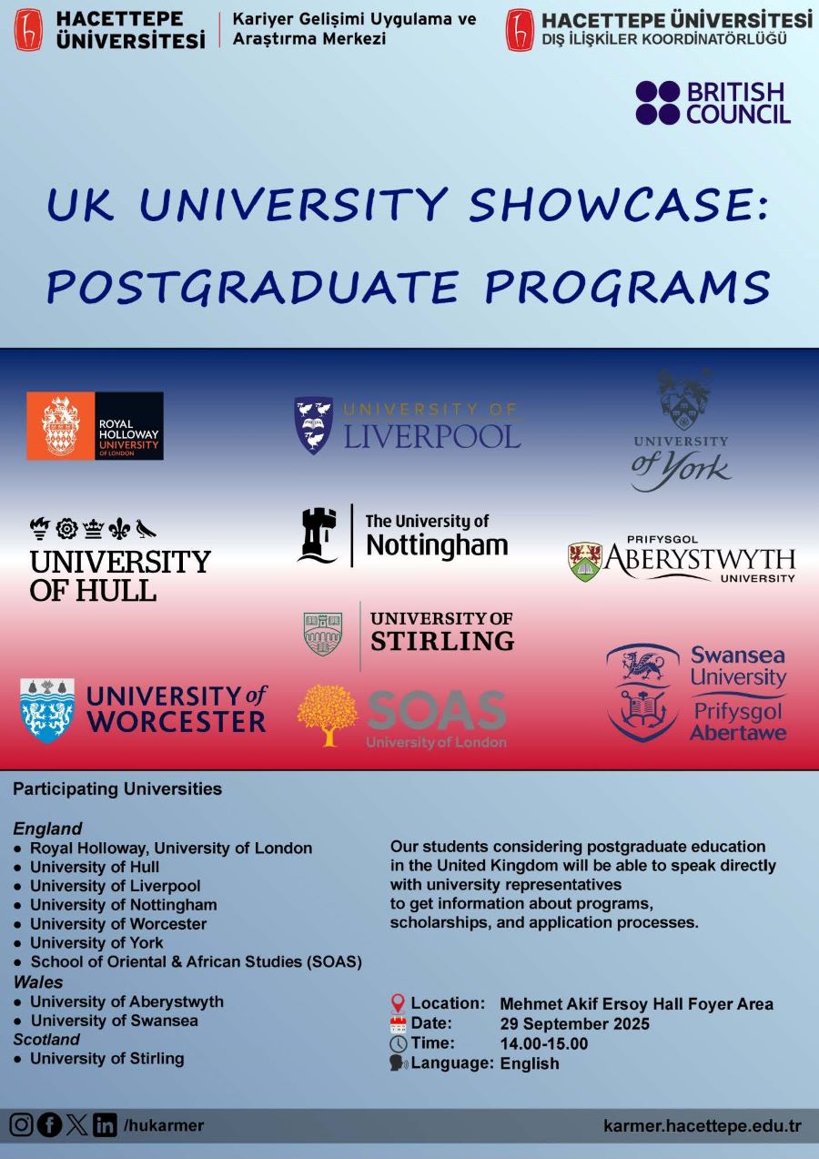 We are pleased to announce that Hacettepe University, in collaboration with the British Council, will host the "UK University Showcase: Postgraduate Programs" on September 29, 2025.